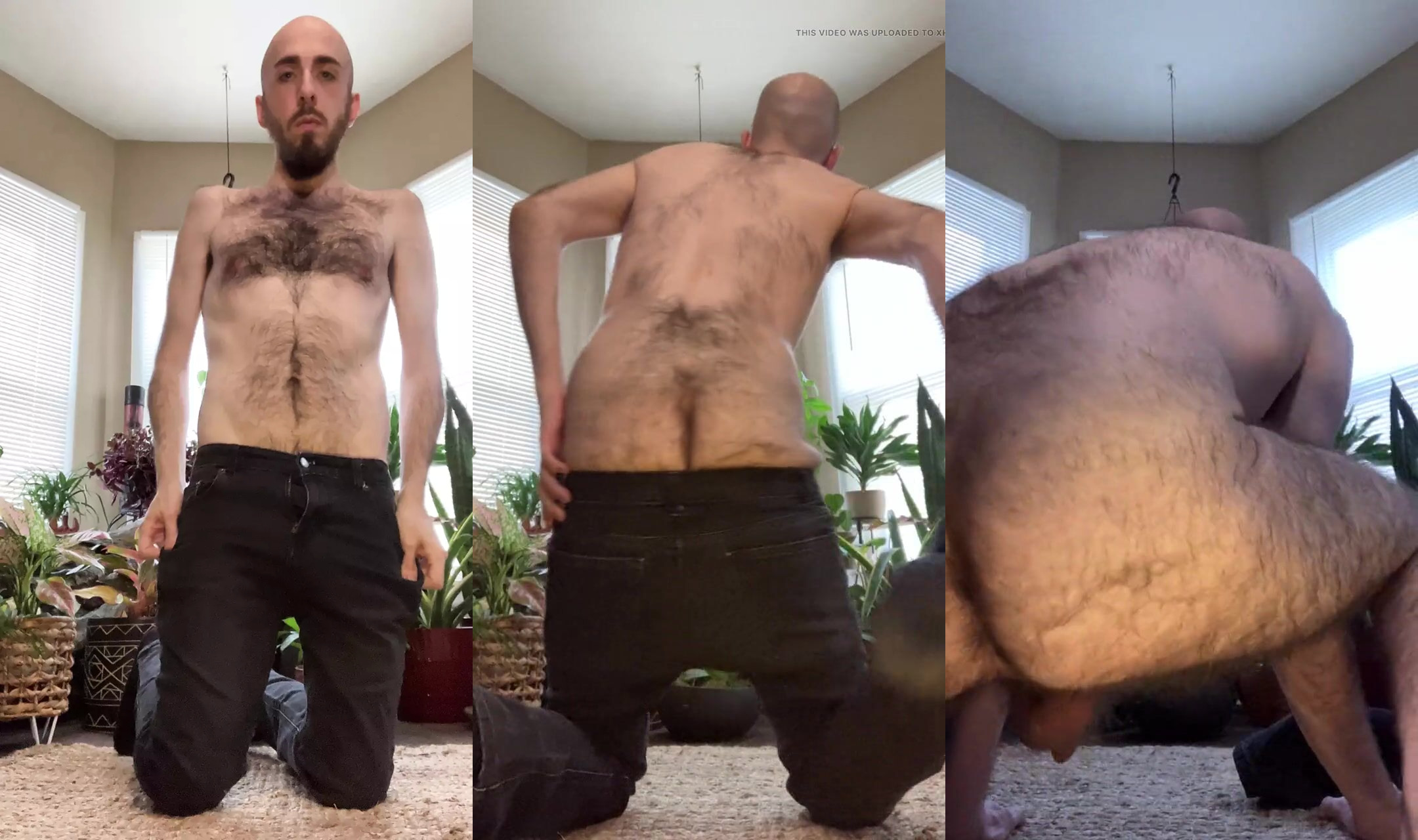 Bald blue-eyed dude getting naked and shaking my very hairy white ass with swinging uncut dick and balls