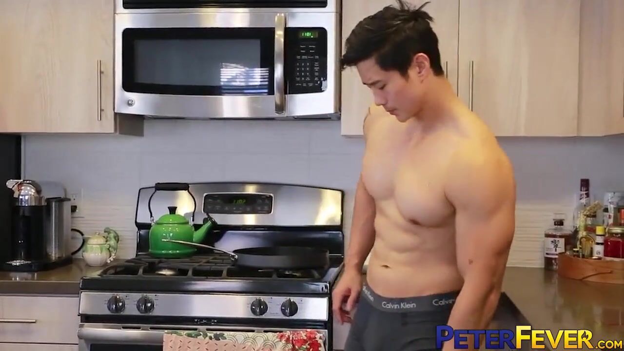 Handsome muscular jock Peter Le alone in the kitchen feeling super horny, so he grabbed his hard throbbing dick and stroked it until he cums.