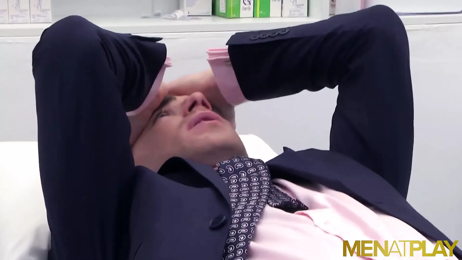 Handsome doctor Mike De Marko seduces his suited patient Kayden Gray into sucking his cock and than bends over to be fucked in tight asshole!
