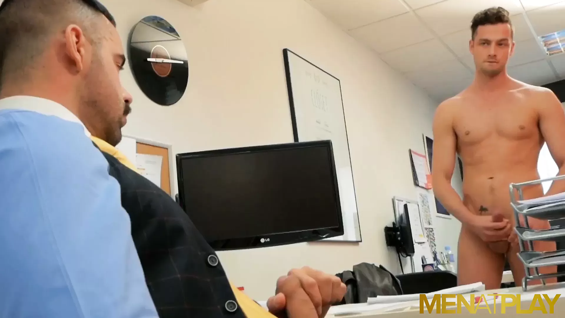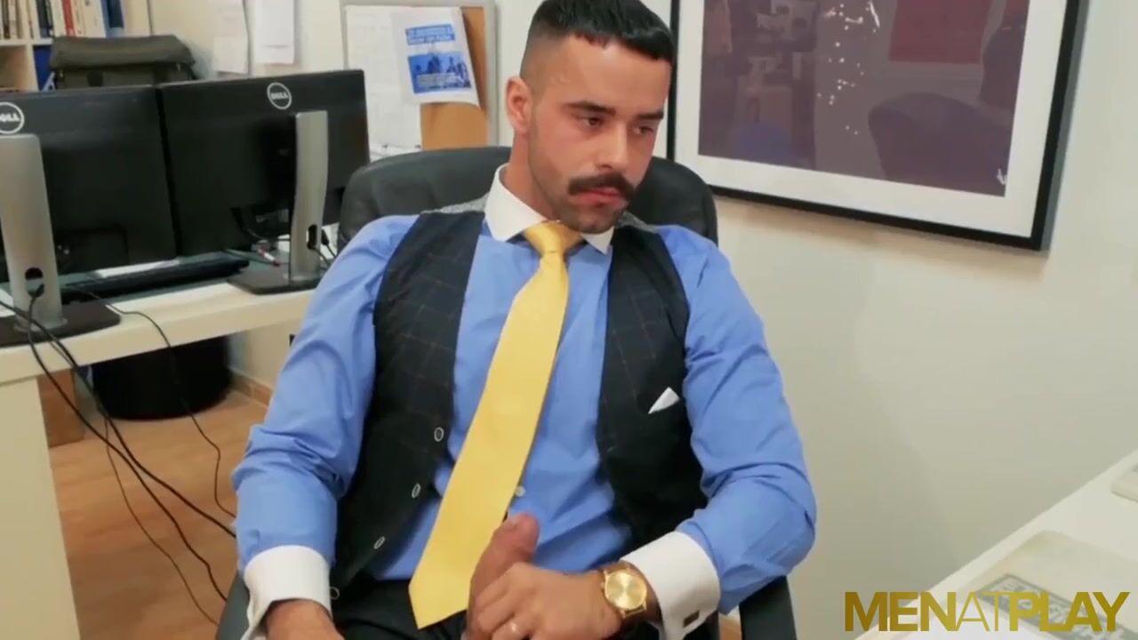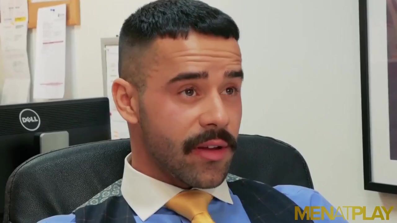 Hairy businessman with mustache Teddy Torres seduces young Damon Heart into sucking his dick and anal breeding him hardcore in his office!