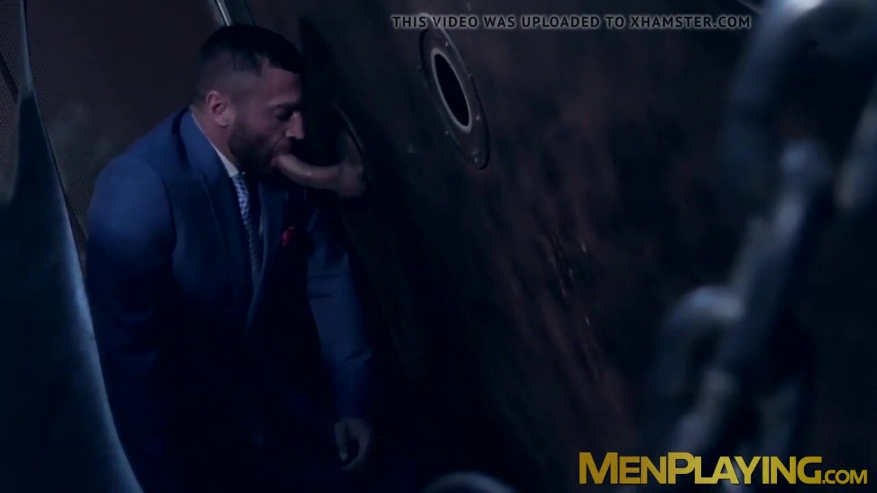 Office worker in a suit jerks and sucks a cock in a glory hole before having his ass rammed deep