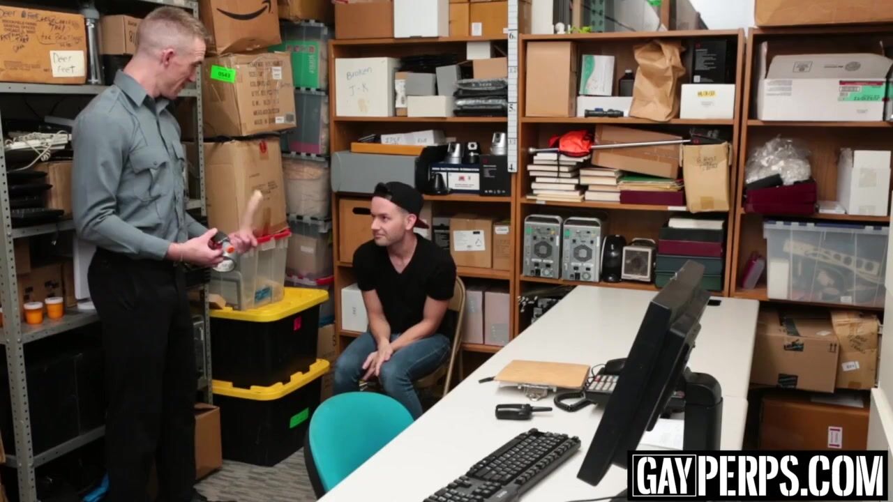 Twink thief's ass gets stuffed with the dildo he stole before the officer in charge took the liberty of penetrating the young man with his raw cock!