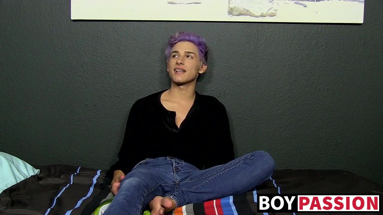 Purple-haired twink is interviewed and then he starts toying around with his adorable little boner while moaning very loudly.