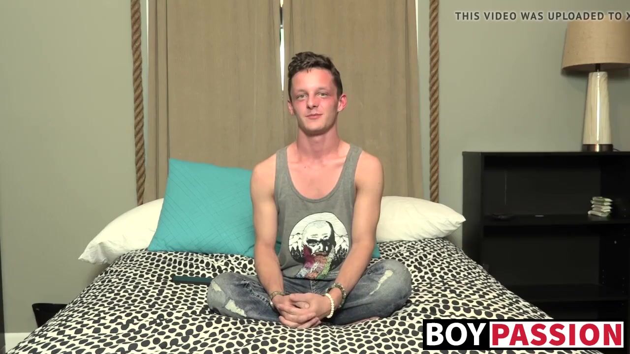 Skinny young lad is interviewed and then he is asked to remove all of his clothes before tugging on his long, thick cock while breathing heavily.