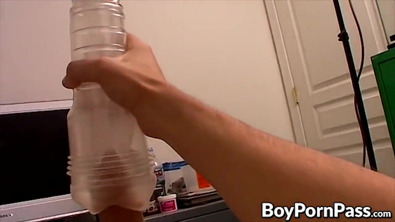 Naughty twink tugs on his hard cock and uses fleshlight before masturbating and tasting his own cum.