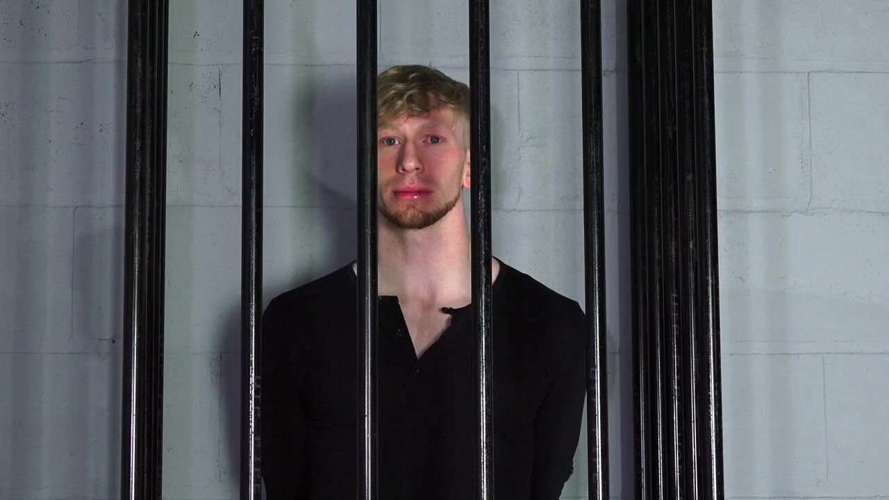 College athlete Jesse Stone, caged in our dungeon, has every torture he will endure described to him, then he is stripped, whipped with the single tail and deep-throated until he cums.