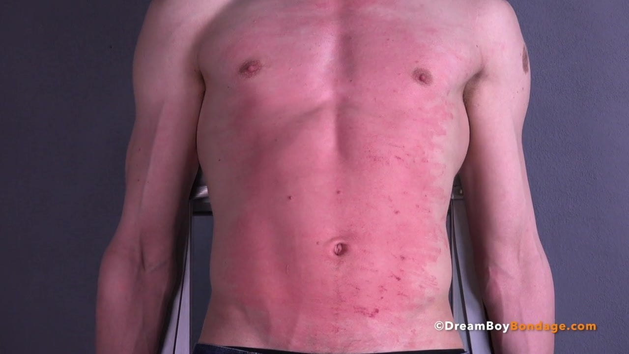 Noah is bound to the ladder as Master Jared comes in with the flogger, beating the pale teen until he's covered in bright red welts..