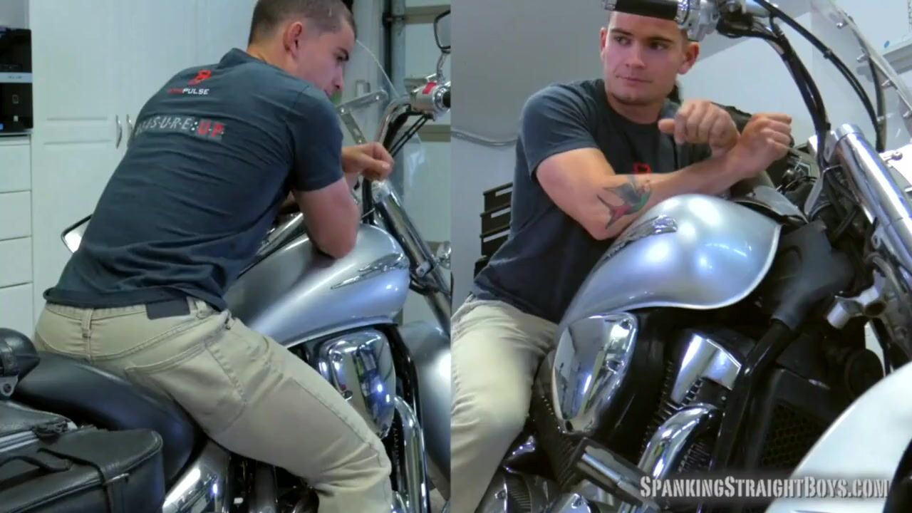 Straight boy Wes is made to get on his motorcycle for a hard spanking and paddling.