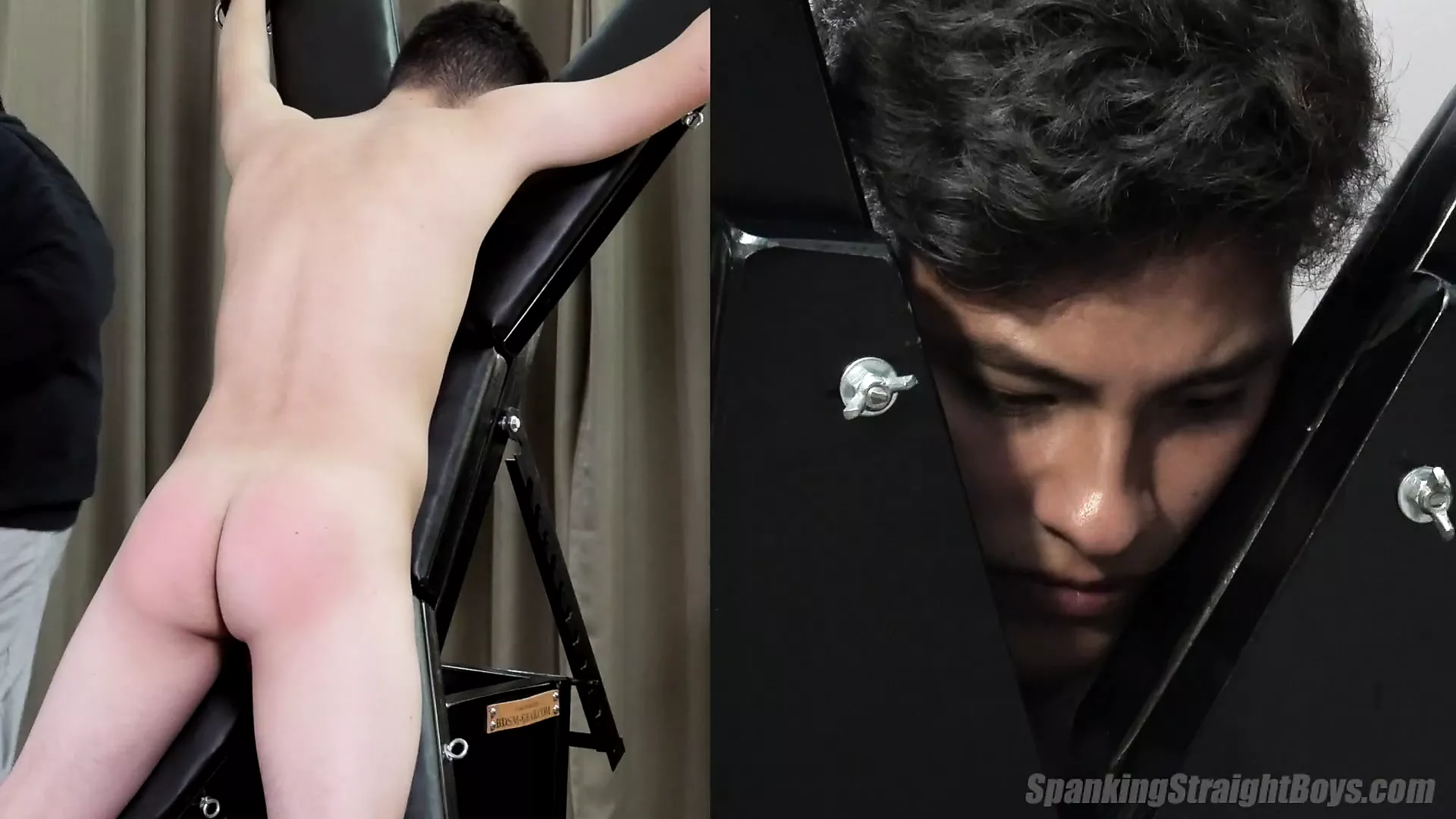 Diego, straight and 20, endures a humiliating spanking while strapped to a bondage cross.
