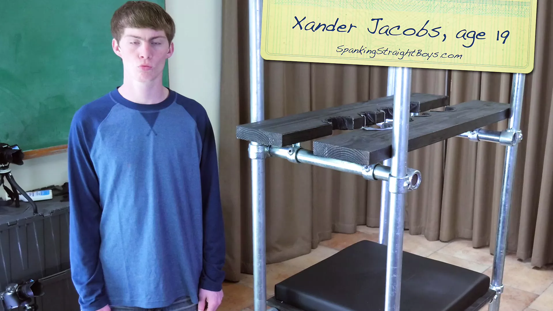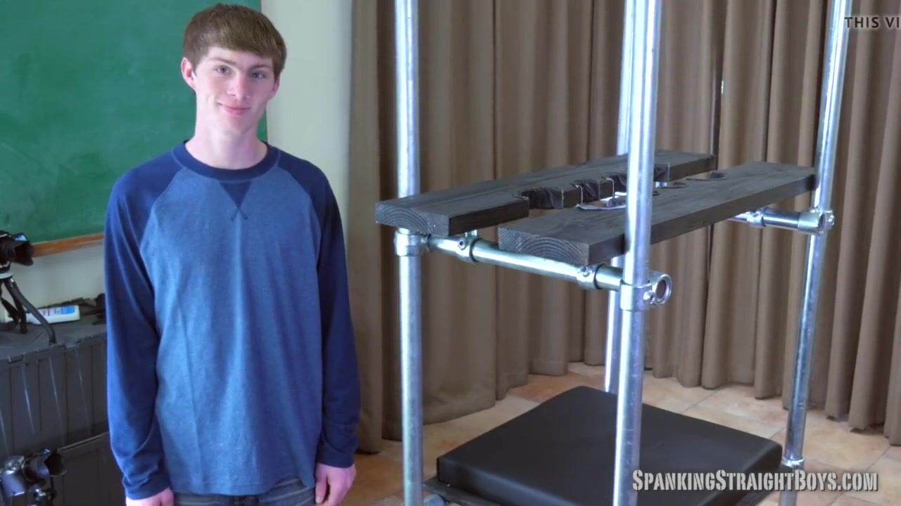 A straight blonde teenage boy, 19, is locked in a spanking tower for a hard spanking from a gay man.