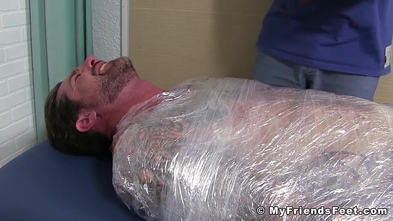 Jock Clint wrapped up to have his feet tickled BDSM style