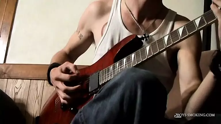 Stud chainsmoker Axel smokes a bunch of cigs one after another before he plays with his awesome guitar and his throbbing cock! This dude rocks!