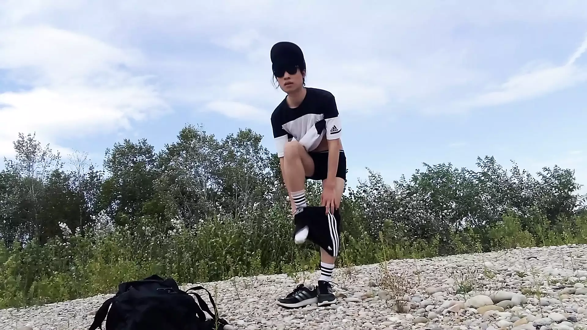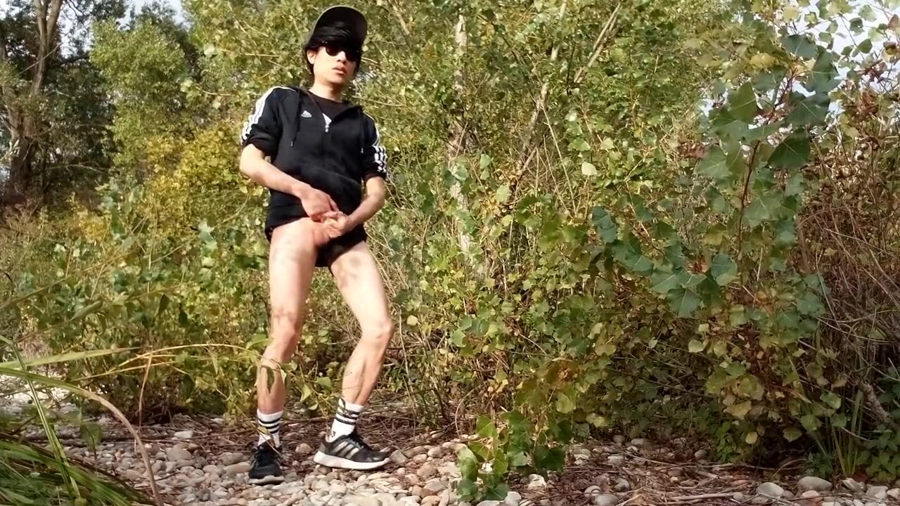 Cute twink Jon Arteen wears black Adidas outfit, shows his underwear, walks freeballing, jerking off throught his short shorts, cumming outdoor Cute gay boy takes off his boxer, walk without underwear, masturbates his penis throught his short shorts, and ejaculates sperm outside in nature Jon Arteen is a gay porn model. The slim Asian boy have black hair, with a bangs haircut. He wears an Adidas outfit with cap, tshirt, short shorts, socks, sneakers Duramo. He wears Ray Ban sunglasses. He takes off his underwear. He walks freeballing oudoors without boxer. He sticks out his penis, wanks his cock, squirts cum on a risky place of the park where somebody could see.