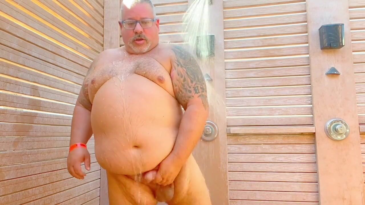 Fat Daddy plays in the shower. His balls are so low and he decides to relieve himself