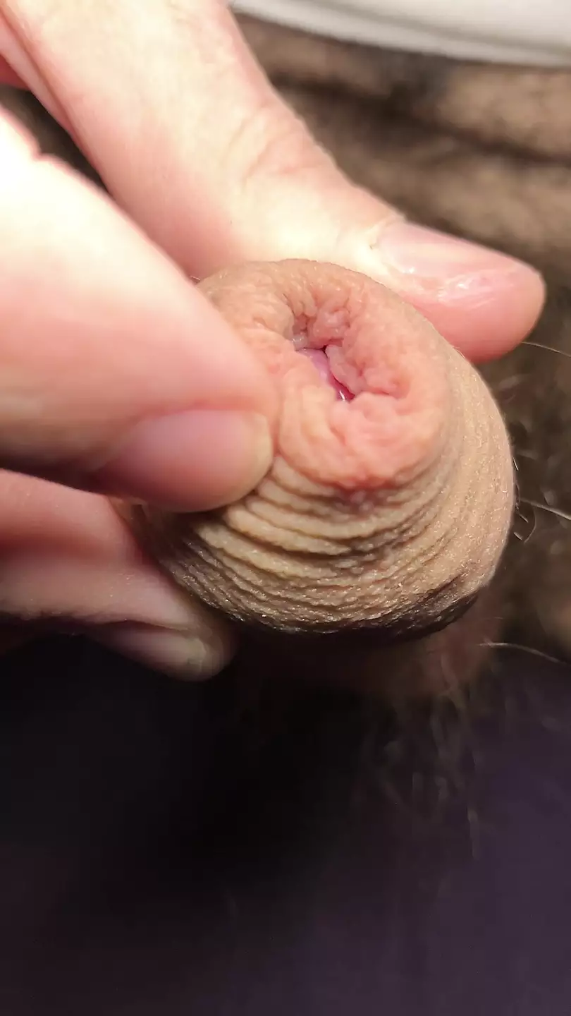 Closeup playing with my foreskin until my very hairy white dick gets hard