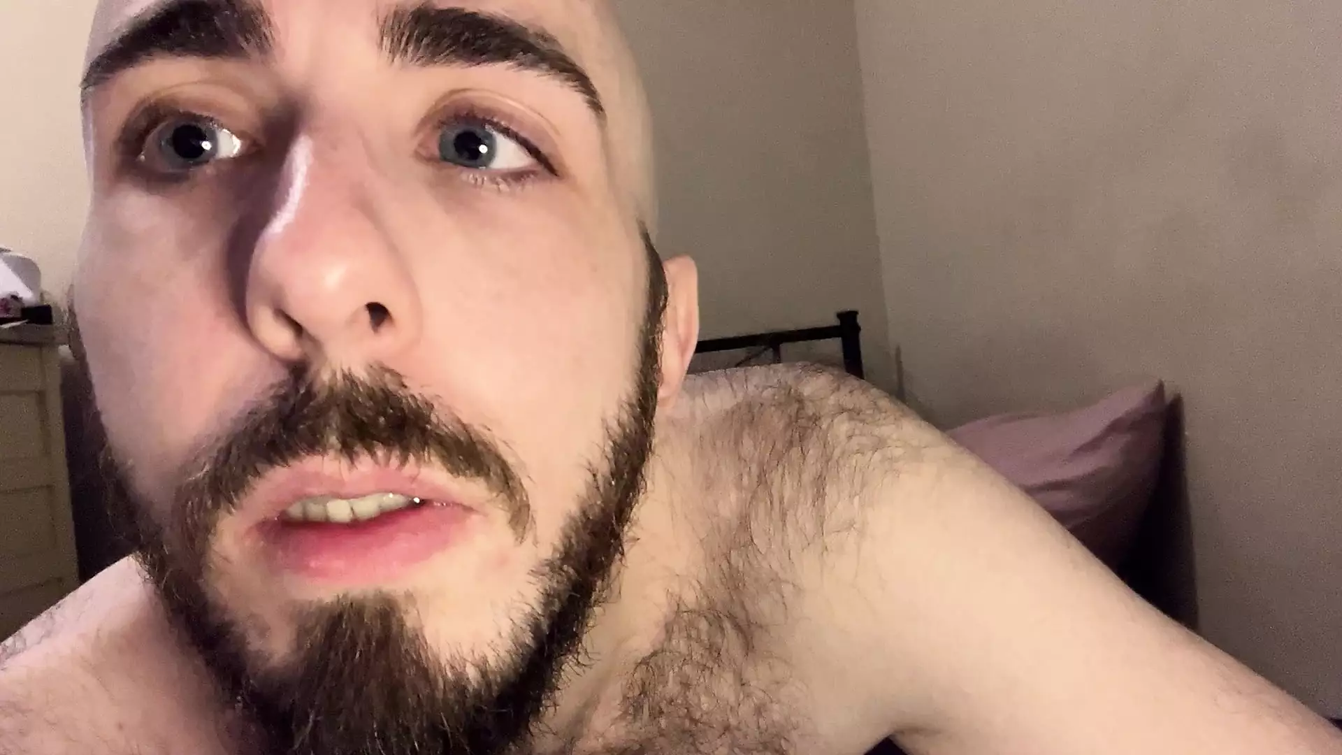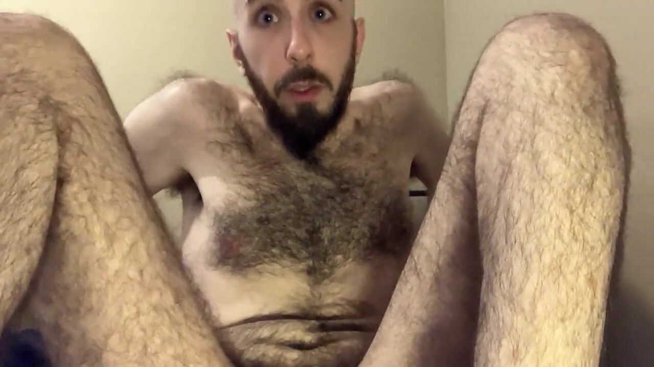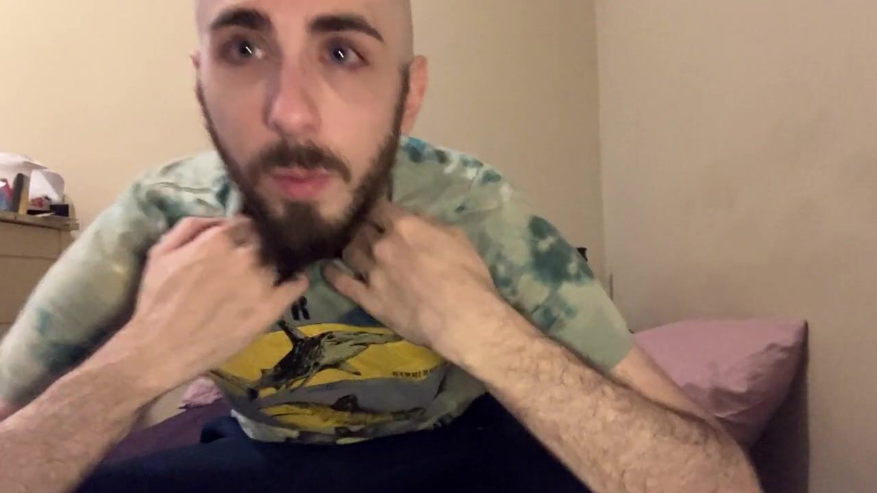 Bald blue-eyed white guy with uncut dick strips down on the bed to reveal very hairy skinny body
