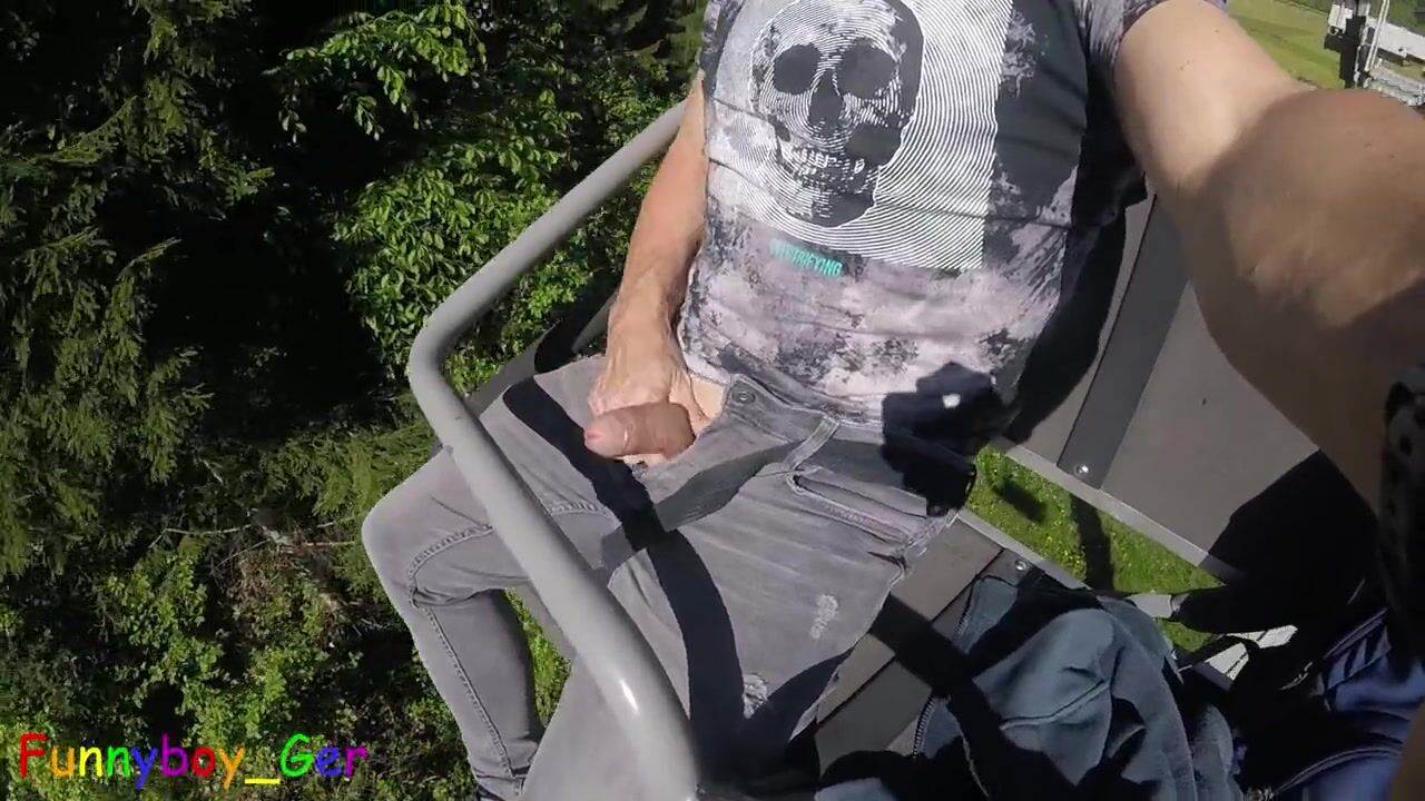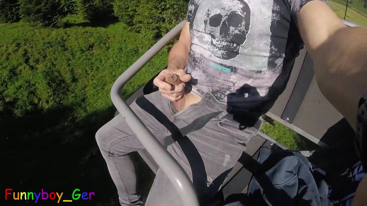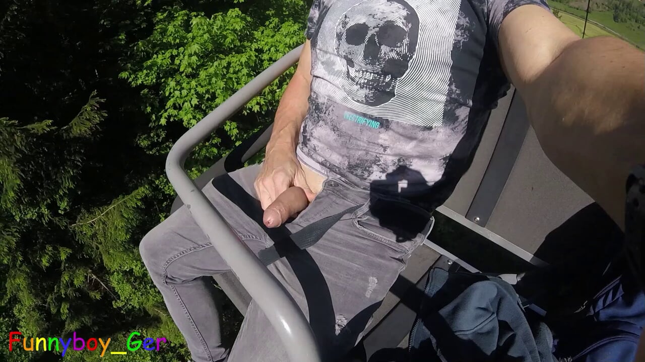 I jerk my hot cock from soft to hard in a moving chair lift. Public fun outside in the Bavarian Alps.