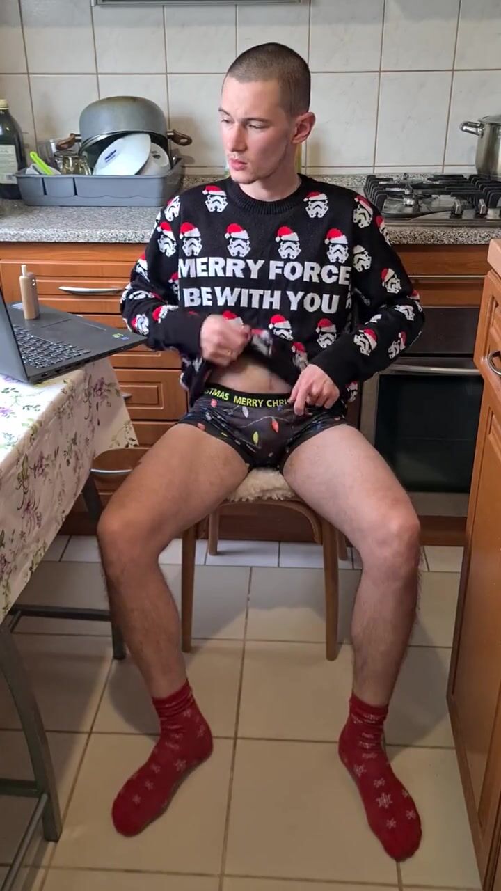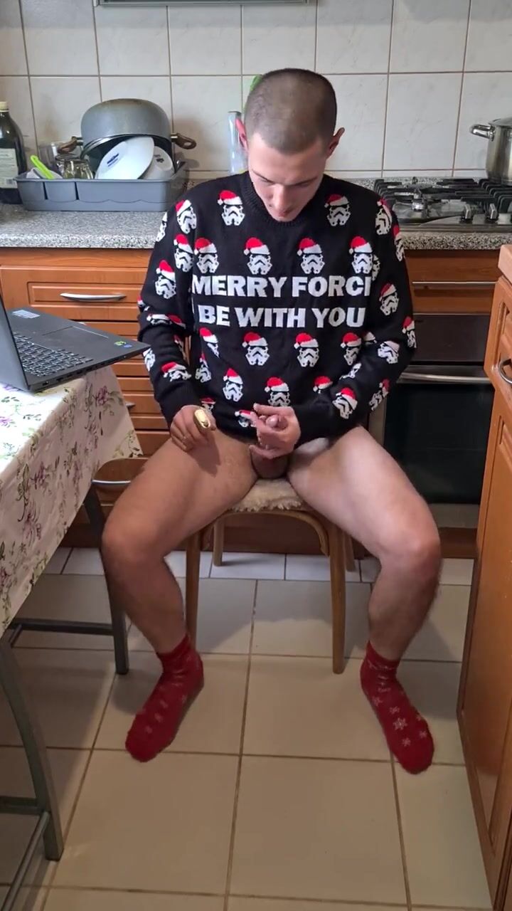 Naughty young horny daddy masturbates his big 7-inch dick while watching porn on a laptop in the kitchen which ends with a real intense orgasm and big cum shot on the floor ...