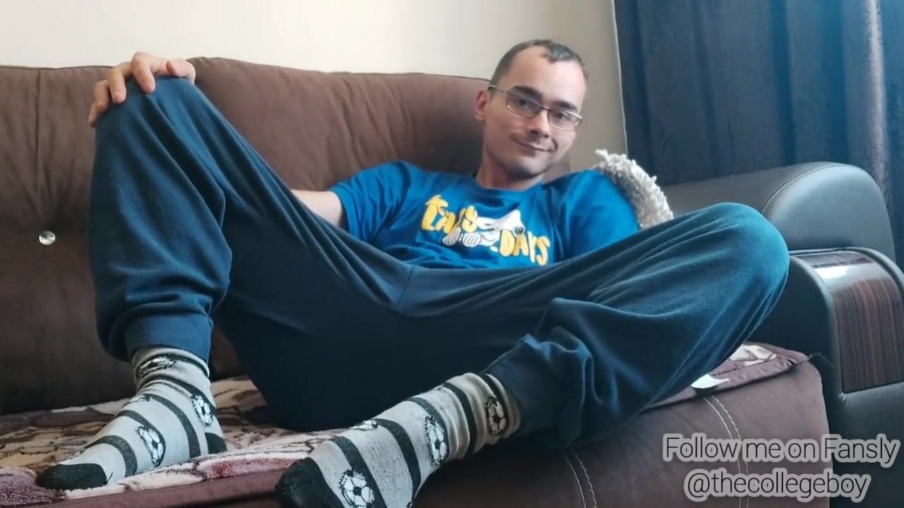A nerdy boy with a big dick is horny, masturbates in cute socks and underwear, and cums hard. Coming home from college, I was horny, my dick became hard and big inside my undies. I started playing with it and satisfying myself, wearing my cute undies and my socks with footballs.