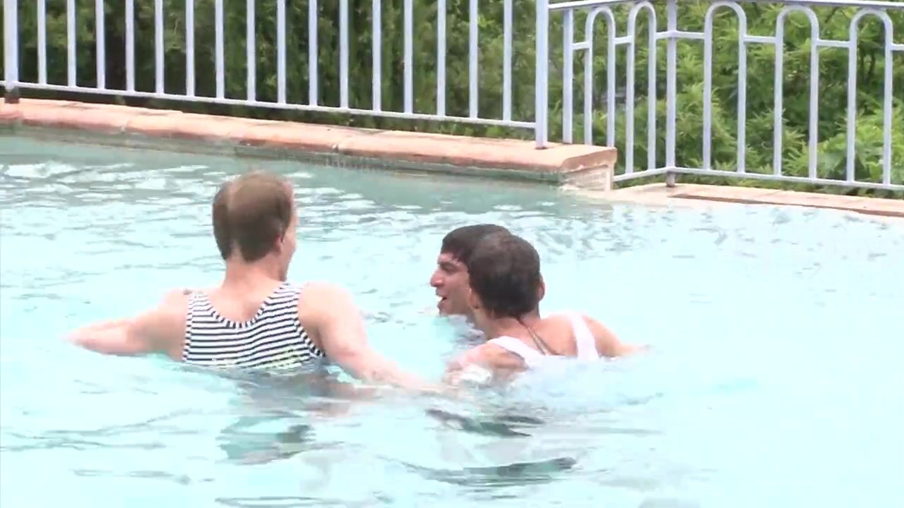 Intense fuck by the pool with three guys with wet cocks