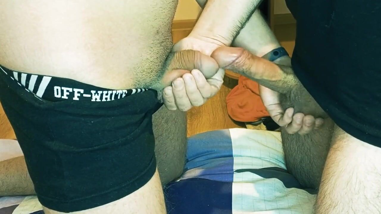 Two gay boys are teasing each other's balls, frotting their cocks and balls, jerking off, and cumming. One of them cums on the face of another.