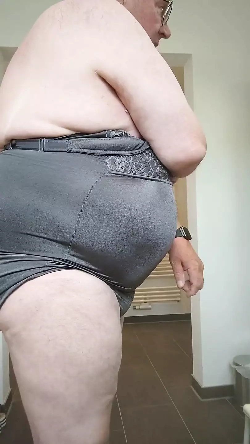 Try on several panties, bra and body of my wife, jerk my cock with a selfmade vibrator and show my big ass.