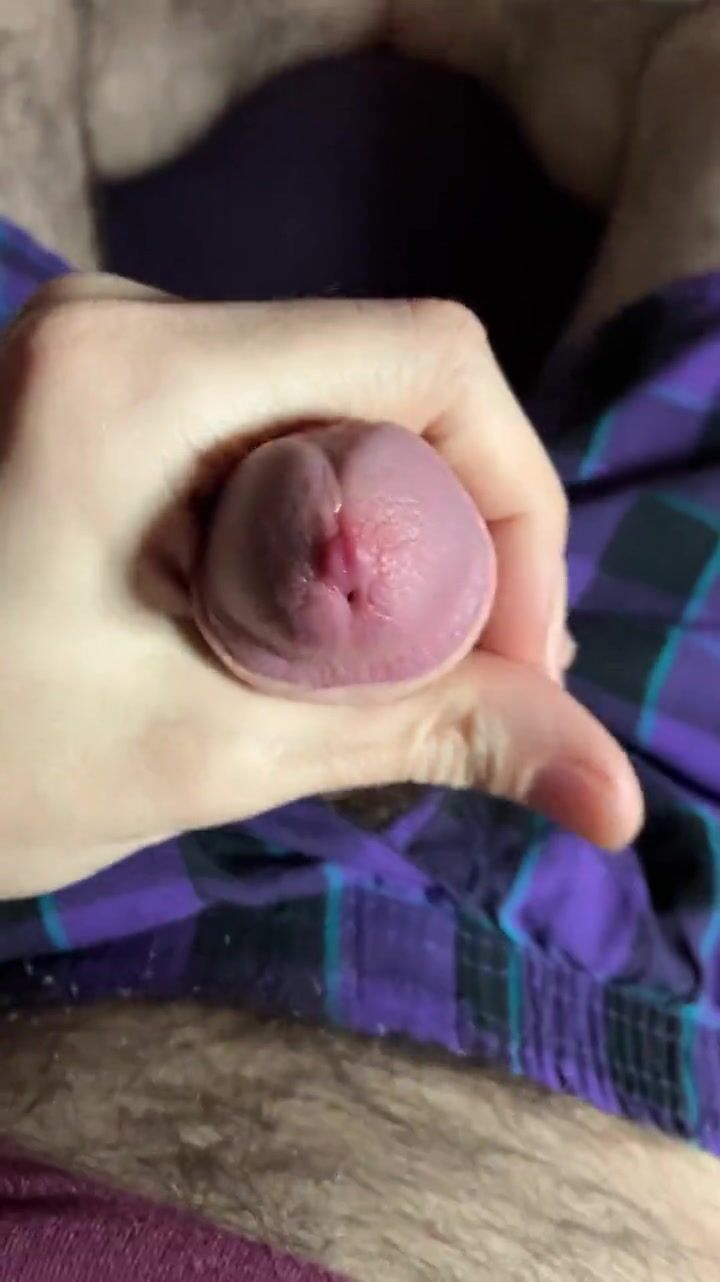 Jerking off big hairy uncut dick through my boxer shorts flap until I cum a thick load on my hand