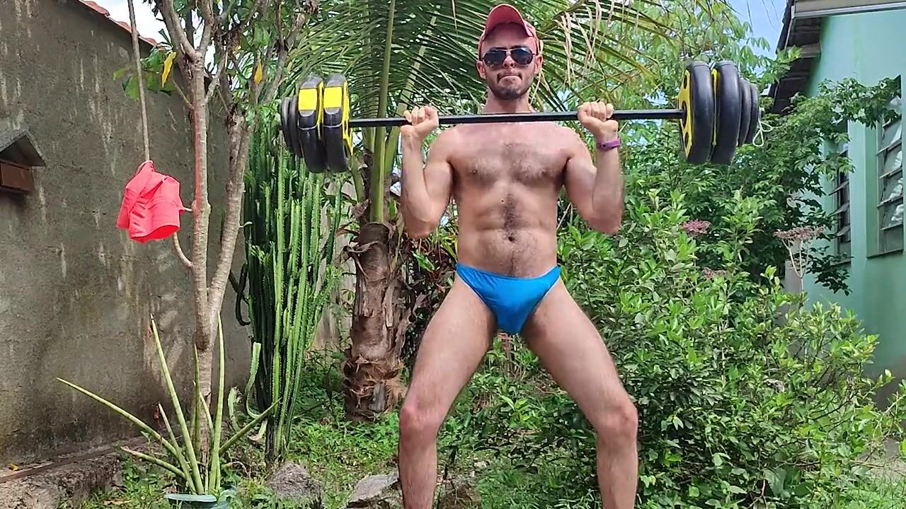Hi! It's me again outdoors doing my arms, biceps and shoulders workout and masturbating myself, all sweaty because of the hot sunbath. It's a delight outdoor fetish! Cum on w/ your hairy wolf!