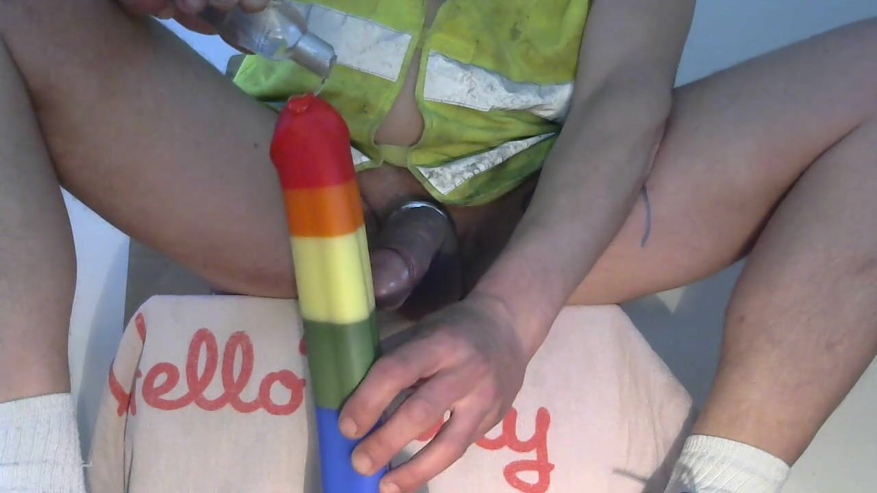 Hung webcam jock with big penis rides huge rainbow cock dildo anal in public random sexchat