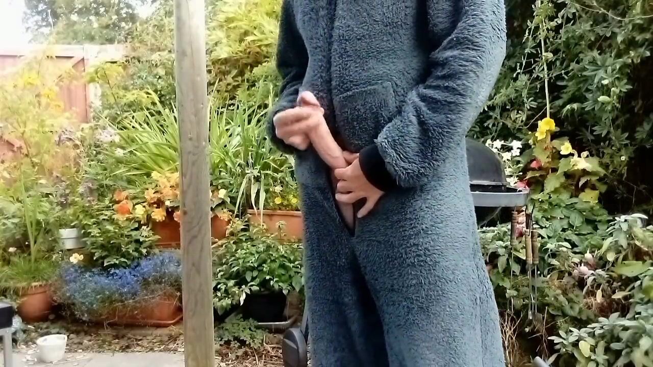 Wearing my onesie outside in the back garden, putting on a show wanking and cumming for the neighbors.