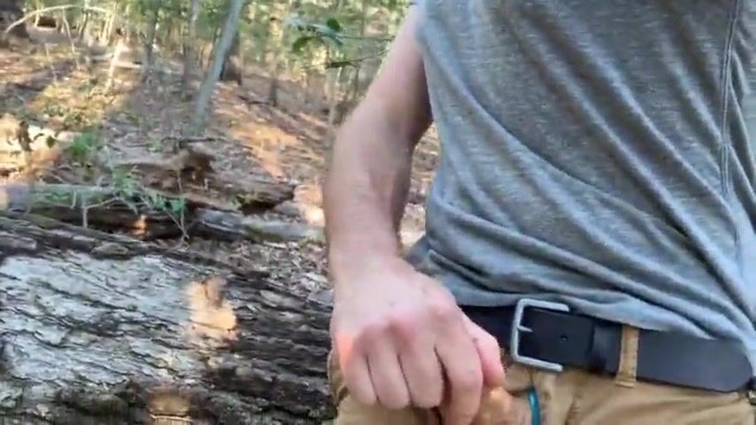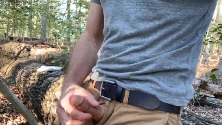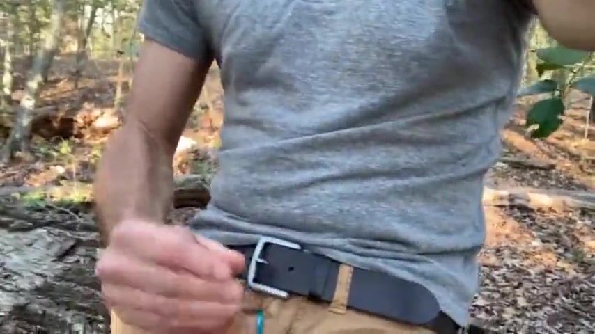 I jerk off and cum in the woods. I am wearing American Eagle shorts and belt. I'm verbal and talking about my jerkoff session.