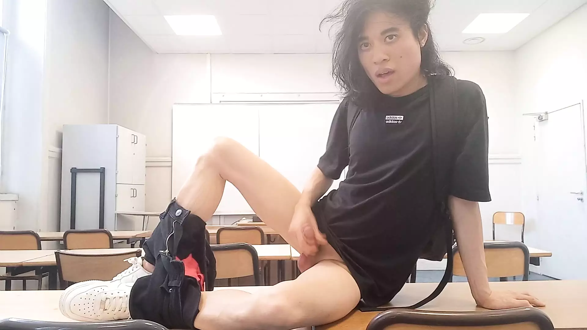 Hot striptease on teacher's desk, horny French-Asian student takes out his dick at school, jerks off in risky college classroom