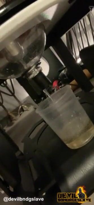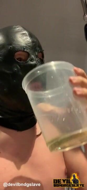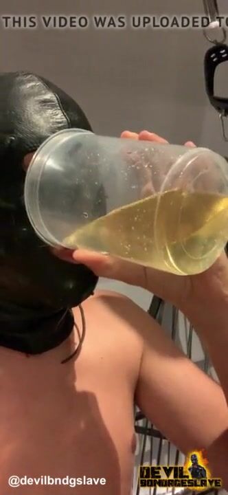 Devilbondageslave in chastity drinking his own piss